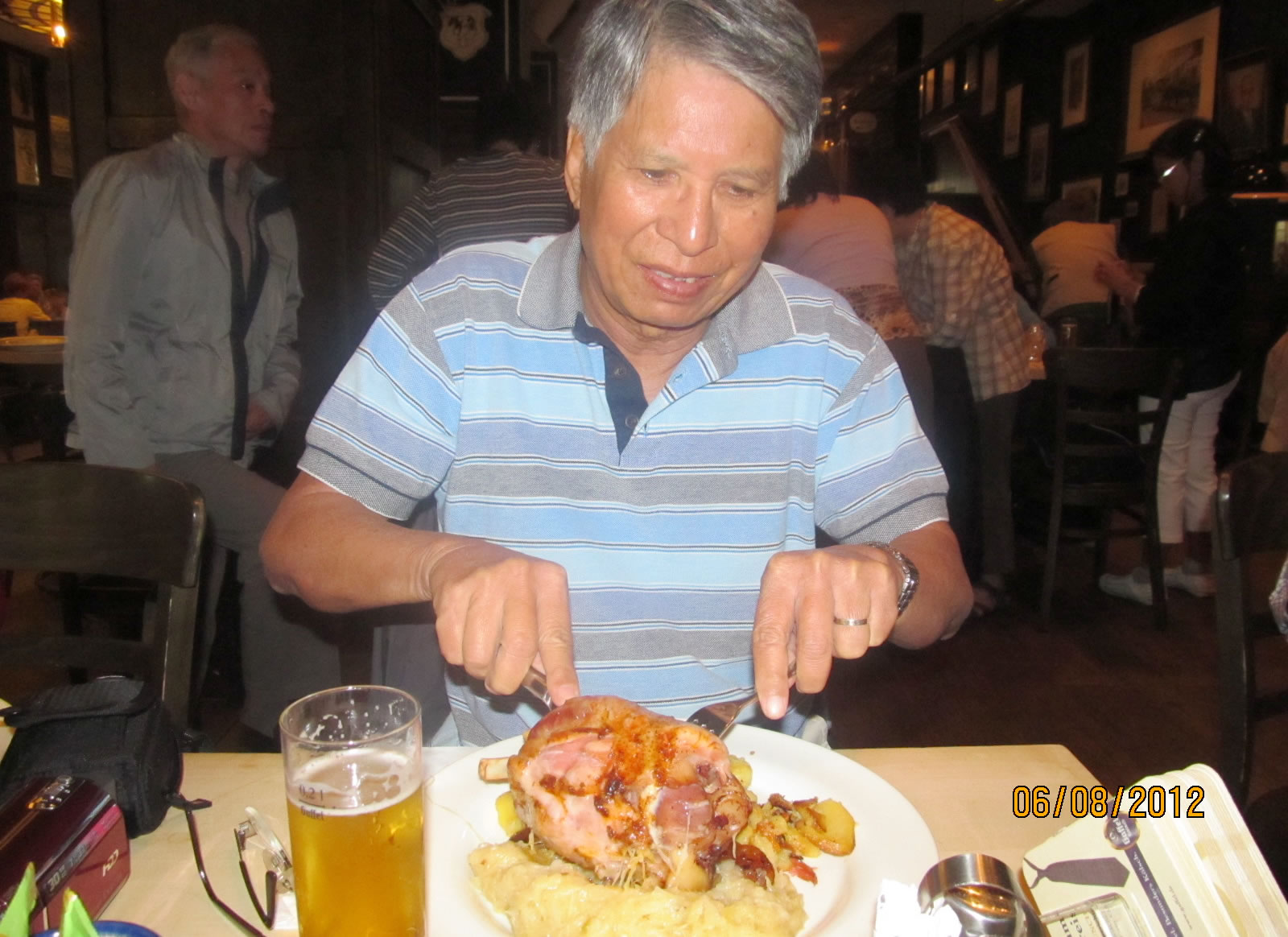 Schweinshaxe ở Cologne tưởng là khác ở Munich. Nhưng cũng rứa. Nhìn cái đùi heo nằm choáng gần hết chiếc đĩa lớn, tôi biết mình lại gặp...nạn. Nhưng dân chịu chơi mà. Lần này nhất định phải quất hết cho dân Đức biết mặt. Tôi loại khoai tây chiên ra. Chỉ tổ tốn chỗ! Bắp cải chua thì OK. Nó giúp đưa cái đùi heo vào dạ dầy. Ly bia cũng là một trợ thủ đắc lực. Bà bạn đồng hành bên cạnh lần đầu tiên chạm mặt với đùi heo rùng mình hỏi với sang: sao hết được? Tôi khẳng khái: hết chứ! Tay dao tay nĩa, tôi cố gắng. Được hơn nửa cái đùi, cái bụng bảo ngưng. Ngưng sao được. Cứ tiếp tục nhét. Nhưng rồi cái miệng lên tiếng bảo thôi. Đành thôi. Gần nửa cái đùi heo đỏ au còn lại trên đĩa nằm nhởn nhơ như trêu ngươi. Nếu có thể vái được chắc tôi vái ngay. Xếp dao nĩa lên đĩa, tôi phất cờ trắng đầu hàng. Hai lần ra quân, hai lần thua trông thấy. Dân Đức mạnh thật! Bữa cơm chiều hôm đó tại Bonn là không cần thiết.