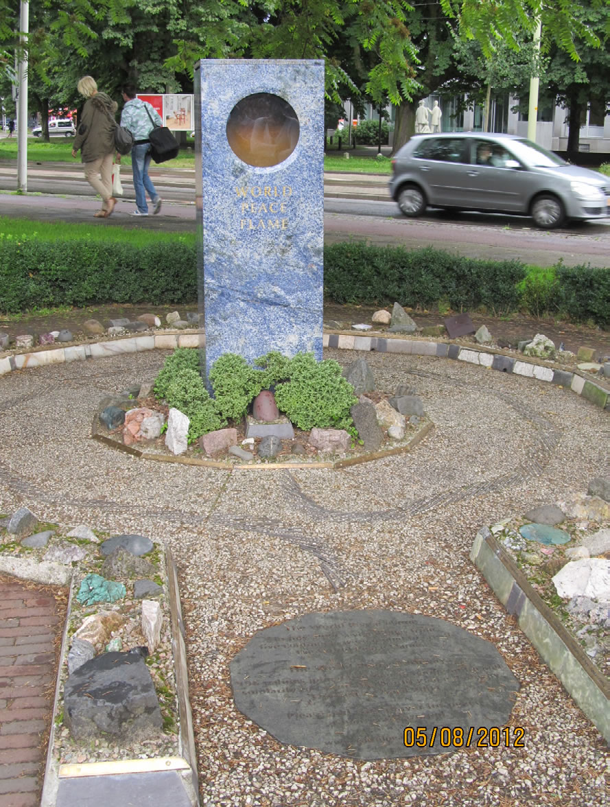 Tôi tới toà án này chẳng với tư cách chi. Sức mấy mà được hầu tòa. Vậy nên vào một sáng Chủ Nhật, trời rất buồn, mưa sùi sụt, tôi lơ ngơ đứng trước tòa. Hai cánh cửa sắt có hoa văn rất cầu kỳ đóng im ỉm. Qua một khu vườn rộng, tòa nhà bên trong với những chiếc tháp cái lớn cái nhỏ nhô lên từ mái nhà sừng sững vẻ lạnh lùng. Du khách nườm nượp được các xe ca đổ xuống với những máy hình máy quay phim lỉnh kỉnh ra sức tìm góc cạnh chụp. Nhìn tòa nhà nghiêm nghị xa cách chừng dăm phút là thấy...cách xa, tôi chú ý tới đám du khách đang bao quanh một khu nho nhỏ bên phía phải. Họ làm chi vậy cà? Tôi chỉ nhìn thấy bên cạnh đám đông vài chiếc ghế đá vẽ hoa lá cành với màu sắc diêm dúa. Kể cũng lạ. Tôi đoán thâm ý của họ là mang màu sắc vào cho tòa nhà bớt vẻ nghiêm trang cô quạnh chăng. Tiến tới đám đông tôi thấy một kiến trúc nhỏ, thấp, có một chiếc lỗ tròn bên trong leo lét cháy một ngọn lửa. Quan sát một hồi mới biết đây là “ngọn lửa hòa bình thế giới”. Ngọn lửa cháy vĩnh cửu này do 197 quốc gia đã phê chuẩn bản “Tuyên Ngôn Hòa Bình” chung sức tạo dựng vào tháng 4 năm 2004. Các tòa đại sứ của các quốc gia này tại Hòa Lan đã góp mỗi nước một viên đá đặc trưng của nước mình tạo thành một vòng tròn quanh tháp lửa. Tôi tò mò lần theo tên các nước. Cũng dễ vì họ xếp theo vần ABC. Cục đá của Việt Nam nằm gần chót vòng tròn, nằm giữa Venezuela và Yemen. Nhưng hòn đá nào của Việt Nam, tôi không chắc chắn vì họ xếp so le. Tôi thấy có một tảng cẩm thạch xanh to hơn mấy hòn đá chung quanh đoán già đoán non là của nhà nước ta. Chẳng biết có đúng không. Thường thì nhà nước ta bao giờ cũng vẫn muốn...khẳng định!