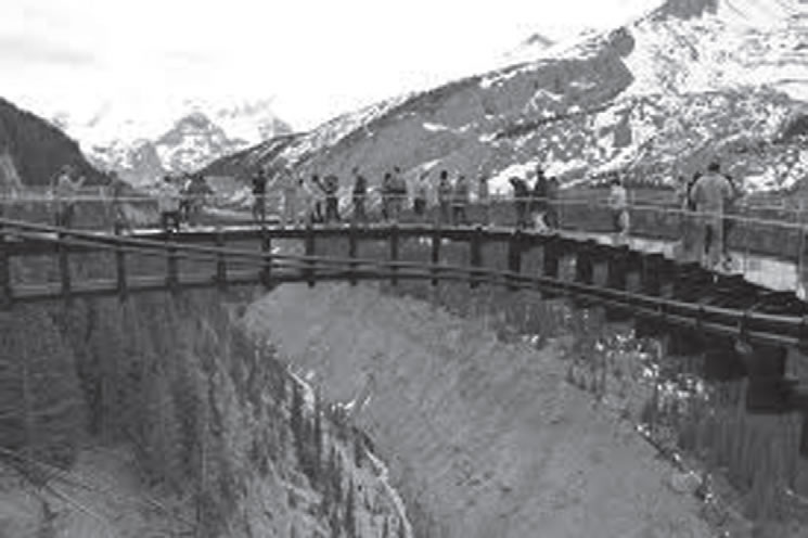 Con người khai thác núi khá kỹ. Rất nhiều món ăn chơi quyến rũ du khách. Chúng tôi đã hưởng đủ tam khoái của vùng Banff. Ngoài gondola còn có Glacier Skywalk, Glacier Adventure. Glacier Skywalk là một công trình đáng nể mới chỉ được khánh thành khoảng một năm nay. Từ triền núi cao, người ta dùng thép tạo ra một hành lang nhô ra đứng chơ vơ giữa trời trên độ cao 280 thước. Vòng cung ngoài cùng được lắp toàn mặt kính trong veo dưới sàn cũng như lan can khiến con người đứng trên có cảm giác như đang đứng chông chênh giữa trời cao núi rộng. Tôi tiến bước từ khung thép ra vòng kính một cách dè dặt. Tay vịn vào lan can, những bước đầu tiên trên sàn kính nghe run run bàn chân. Cảm giác như đi giữa chân không. Một lúc sau mới dám nhìn xuống. Núi nằm dưới chân. Một chập cũng quen đi tuy người vẫn nổi gai với ý nghĩ mình có thể rơi xuống bất cứ lúc nào. Như vậy có thể được coi là…chì. Có những người bên cạnh tôi bò lê bò càng, chân cẳng nhũn ra không đứng lên nổi. Có những thân người ngả nghiêng xiêu vẹo, húc người này, dựa vào người kia. Có người đưa tay ra cố nắm vào bàn tay của người đi bên cạnh dù quen hay không. Những tiếng rú tiếng cười tiếng hét vang lên ầm ỹ. Người nào như cũng thích thú trong nỗi sợ hãi. Cái sợ phải mua bằng tiền. Bao nhiêu? Hai mươi bốn đô chín mươi chín xu!