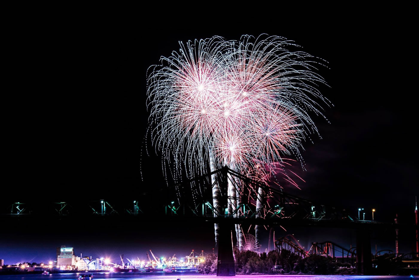 Ngay từ năm đầu đặt chân tới Montreal, chúng tôi đã chen vai thích cánh với cả rừng người nghểnh mặt lên trời coi những đốm màu vun vút bay lên cao. Cuộc thi đốt pháo bông diễn ra vào ngày thứ tư và thứ bảy mỗi tuần trong mùa hè. Sau bữa cơm chiều vội vàng, cả nhà leo lên xe buýt tới bên bờ sông Saint Laurent, khúc gần cầu Jacques Cartier, để thưởng thức cuộc vui bình dân nhưng rất hấp dẫn. Khi chúng tôi tới, người người đã đông nghẹt. Vị trí coi tốt nhất là leo lên cầu. Vừa mát vừa rõ ràng như coi xi nê hạng danh dự. Nhưng có bao giờ chúng tôi leo lên được đâu. Biển người đông nghẹt thiếu điều sập cầu! Có những người tới từ buổi trưa, khi mặt trời còn chói lọi, trải khăn làm một cuộc picnic nho nhỏ, chờ tới 10 giờ tối coi pháo bông. Có lẽ họ là những người đang vắt vẻo trên cầu. Vị trí coi rõ nhất là khán đài. Rõ mồn một. Nhưng muốn có một chỗ dưới ánh…pháo thì phải móc túi, một chuyện mà đám đông rất ngại ngùng.