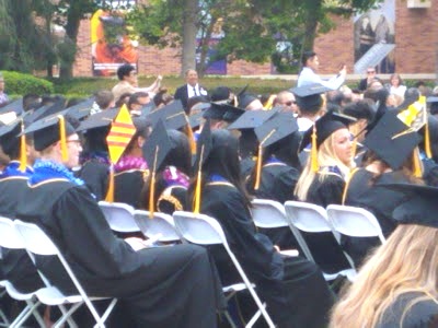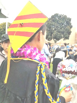 Chiếc mũ cờ vàng ba sọc đỏ của em Danny Vũ giữa những chiếc mũ đen tại Đại học UCLA.